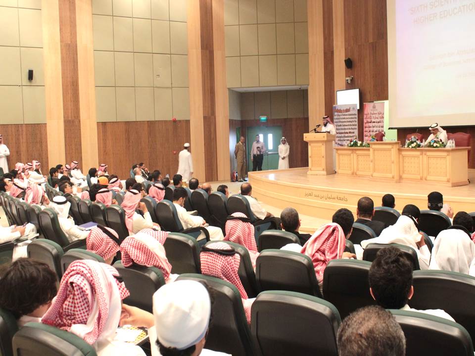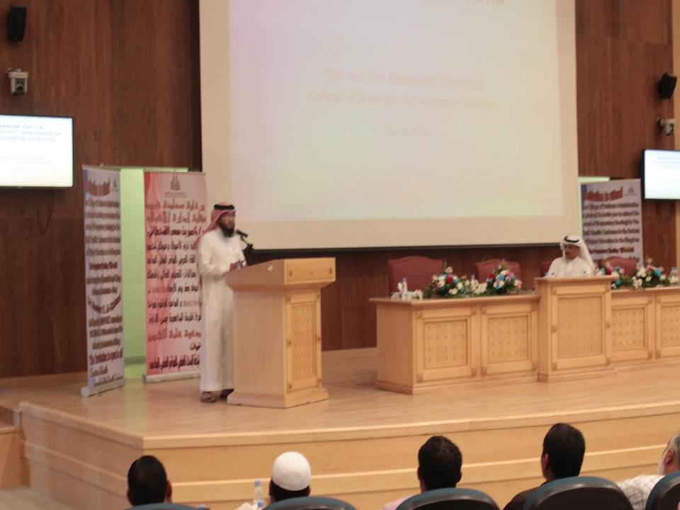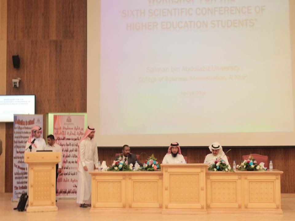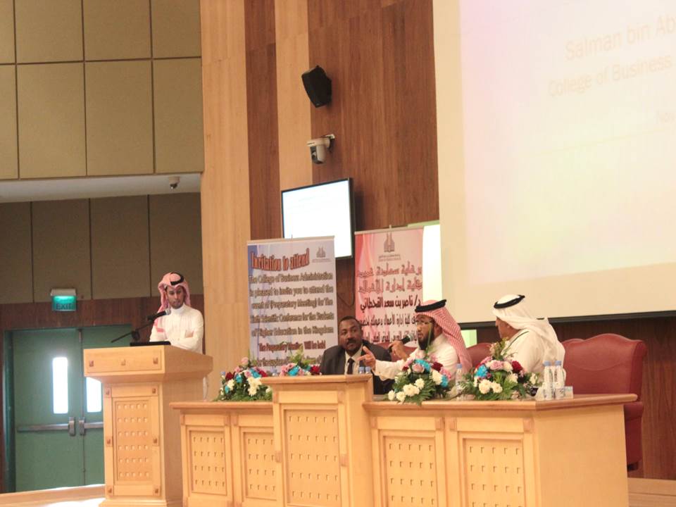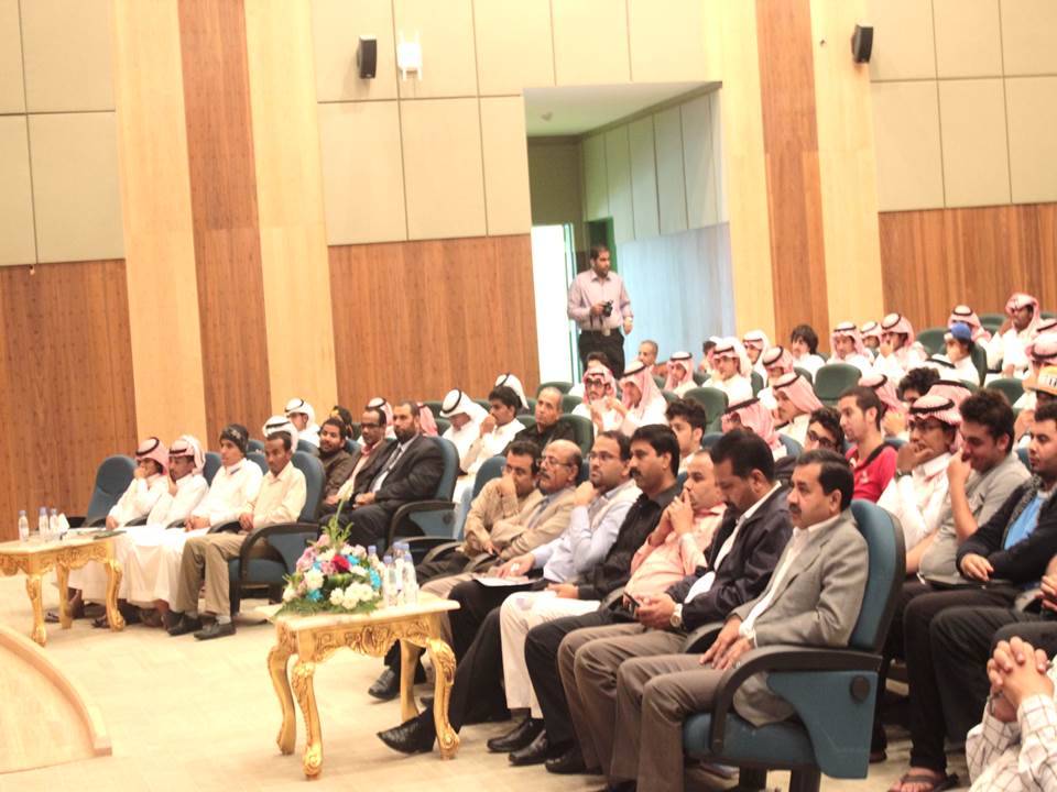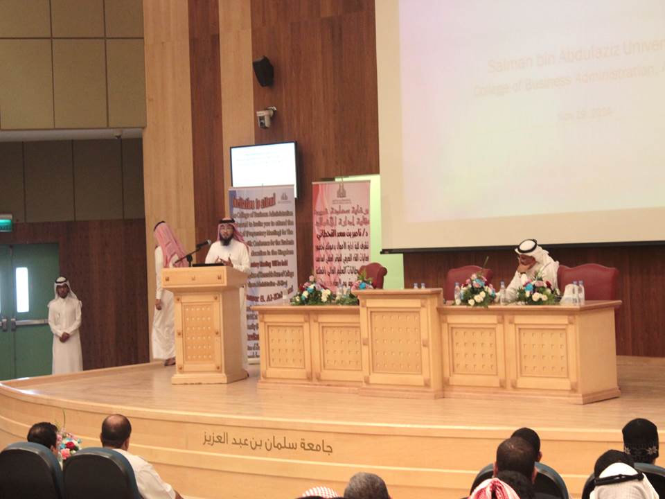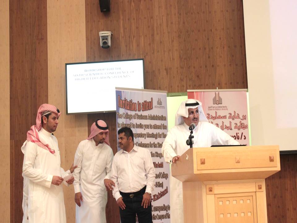 استمراراً للحملة التعريفية للمؤتمر العلمي السادس، استضافت كلية إدارة الأعمال بالخرج أمين المؤتمر العلمي الدكتور/ عمر بن محمد دين في لقاء حضره وشرفه سعادة عميد الكلية الدكتور/ ناصر القحطاني، وعدد كبير من أعضاء هيئة التدريس بالكلية، وجمهور غفير من الطلاب، وذلك يوم الأربعاء الموافق 26/1/1436هـ في المسرح الرئيسي بالجامعة.واستُفتح اللقاء بآيات من الذكر الحكيم تلاه أحد طلاب الكلية، أعقب ذلك كلمة لسعادة عميد الكلية الدكتور/ ناصر القحطاني وضح فيها أهمية مشاركة الطلاب في هذا المؤتمر لما فيه من الفوائد العديدة ، وحث في كلمته أعضاء هيئة التدريس بالكلية للإشراف على الطلاب في إعداد بحوثهم ومشاركاتهم العلمية والثقافية وغيرها، كما أعلن عن الجوائز المرصودة للطلاب من إدارة الكلية وهي عبارة عن مضاعفة الجوائز في حال فوز الطالب على مستوى الجامعة.بعد ذلك ألقى أمين المؤتمر الدكتور/ عمر بن محمد دين كلمة وضح فيها ماهية المؤتمر والأهداف المتعددة من المشاركة فيه وإقامة فعالياته المتنوعة داخل الجامعة وكلياتها، وتأتي في مقدمة تلك الأهداف تطوير قدرات الطلاب ومهاراتهم وصقل مواهبهم وبناء شخصياتهم من خلال إعدادهم للمشاركات، ومن خلال مشاركتهم في الفعاليات والبرامج التحضيرية المتنوعة التي تقام على مستوى الجامعة والكليات كالدورات وورش العمل واللقاءات العلمية.كما بين في حديثه المحاور المتاحة للطلاب أن يتنافسوا فيها، والجوائز المرصودة لكل محور والتي تبلغ إجماليها أكثر من مائتي ألف ريال، وكذلك الجوائز الخاصة المقدمة من معالي مدير الجامعة.واختتم الدكتور عمر كلمته بشكر سعادة عميد الكلية لاهتمامه بالمؤتمر وحرصه على تميز الكلية في التحضير له، كما شكر منسق الكلية للمؤتمر الدكتور فخرالدين موسى وفريق العمل المساند له على حسن الإعداد والتنظيم للقاء، متمنياً لهم التألق والإبداع في مشاركات المؤتمر.وقد ساند الدكتور عمر في لقائه من عمادة شؤون الطلاب الأستاذ سلطان العنزي، والأستاذ أحمد بهيان.