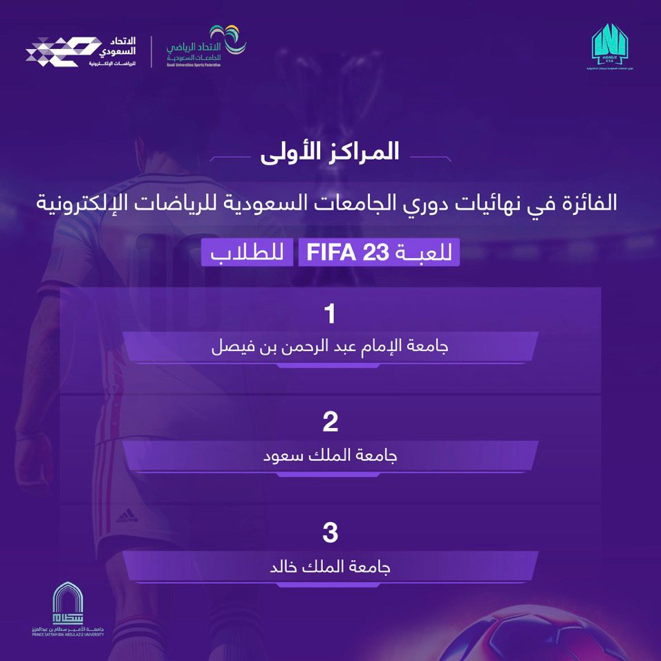 بحضور صاحب السمو الملكي الأمير فيصل بن بندر بن سلطان رئيس الاتحاد السعودي للرياضات الإلكترونية؛ اختتمت أمس الجمعة ١٤٤٤/١٠/٢٩هـ الموافق ١٩ مايو ٢٠٢٣م نهائيات دوري الجامعات السعودية لبطولة فيفا٢٣ الإلكترونية للطلاب والطالبات؛ والتي نظمها الاتحاد الرياضي للجامعات السعودية، باستضافة جامعة الأمير سطام.