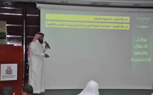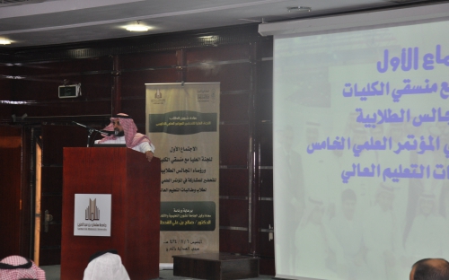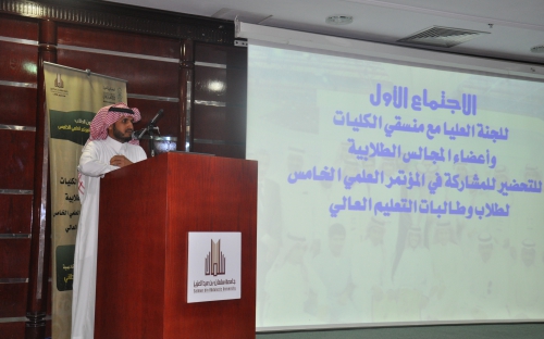 عقدت عمادة شؤون الطلاب ممثلة في اللجنة العليا للتحضير للمؤتمر اجتماعها الأول مع منسقي الكليات ورؤساء المجالس الطلابية ونوابهم، وذلك ضمن استعدادات الجامعة للمشاركة في المؤتمر العلمي الخامس لطلاب وطالبات التعليم العالي، وذلك يوم الخميس الموافق 6/11/1434هـ في مسرح وقاعة الاجتماعات في مبنى الهداية، وكان الاجتماع برئاسة سعادة وكيل الجامعة للشؤون التعليمية والأكاديمية الدكتور/ صالح بن علي القحطاني المشرف العام على الأعمال والبرامج التحضيرية للمؤتمر.
