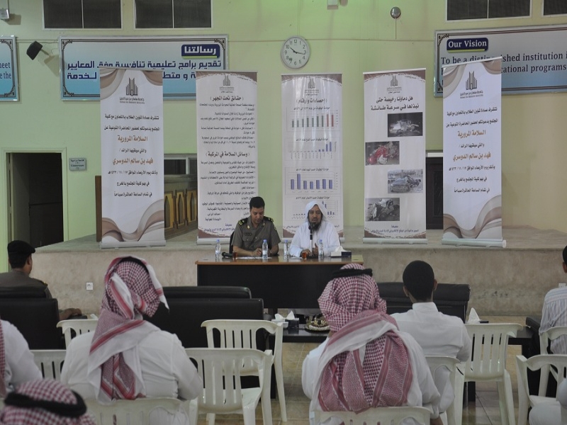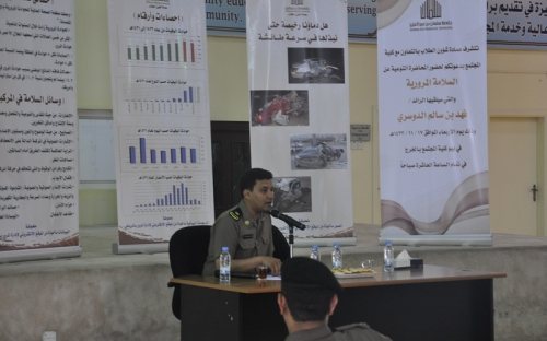 أقامت عمادة شؤون الطلاب و بالتعاون مع كلية المجتمع بالخرج محاضرة توعوية عن السلامة المرورية والتي ألقاها الرائد / فهد بن سالم الدوسري رئيس قسم السير في شعبة مرور محافظة الخرج , و ذلك يوم الاربعاء الموافق 17 / 11 / 1433 هـ في بهو كلية المجتمع , حضرها وكيل كلية المجتمع الدكتور سعيد نزال العنزي وعدداً من اعضاء هيئة التدريس والطلاب.