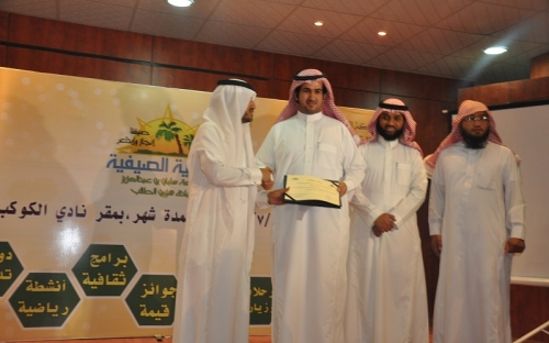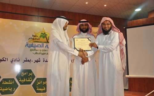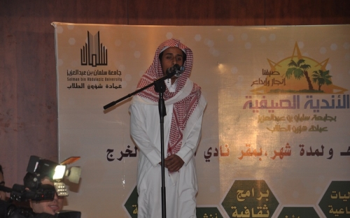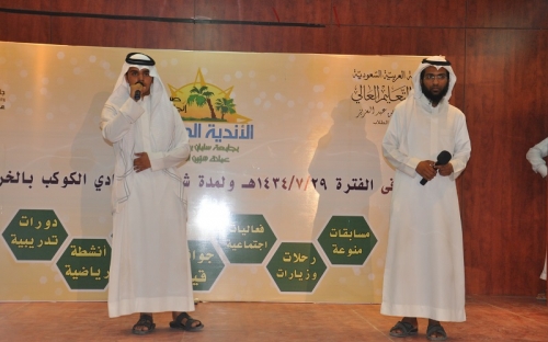 أقام النادي الصيفي الأول بجامعة سلمان بن عبدالعزيز بالخرج للطلاب والذي تشرف عليه عمادة شؤون الطلاب الحفل الختامي لأنشطته وفعالياته وذلك يوم الأحد الموافق 28/8/1434هـ على مسرح نادي الكوكب بحضور عميد شؤون الطلاب سعادة الدكتور مسفر بن محماس الكبيري ومساعد عميد شؤون الطلاب للأنشطة الطلابية الأستاذ جمال الحمداء , حيث بدء الحفل بأيآت من الذكر الحكيم رتلها الطالب عثمان العمودي ثم اللقاء مدير النادي الدكتور عمر محمد دين كلمة تحدث فها بشكل مجمل عن الأنشطة والفعاليات التي أقامها النادي وبعض الإحصائيات وفي ختام كلمة شكر كل من ساهم في إنجاح النادي و في إقامة فعالياته وأنشطته.