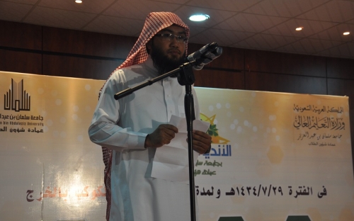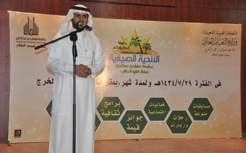 بعدها اللقاء عميد شؤون الطلاب سعادة الدكتور مسفر الكبيري كلمة تحدث فيها عن الأندية بجامعة سلمان بصفة عامة للطلاب والطالبات بجميع المحافظات التابعة للجامعة وعن الإنجازات التي حققتها , حيث أقيمت في هذه الأندية أنشطة نوعية خرجت عن الروتينية , وقال أن إقامة الأندية الصيفية أنما هو امتداد للنشاط الطلابي بالعام الدراسي ولاحتواء الشباب وأشغالهم بالشيء المفيد , وفي ختام كلمته قدم الشكر لمعالي مدير الجامعة الدكتور عبدالرحمن العاصمي لموافقته على إقامة الأندية الصيفية ودعمه لها , كما قدم شكره لسعادة وكيل الجامعة للشؤون التعليمية الدكتور صالح القحطاني ولأعضاء إدارة النادي والمشرفين .