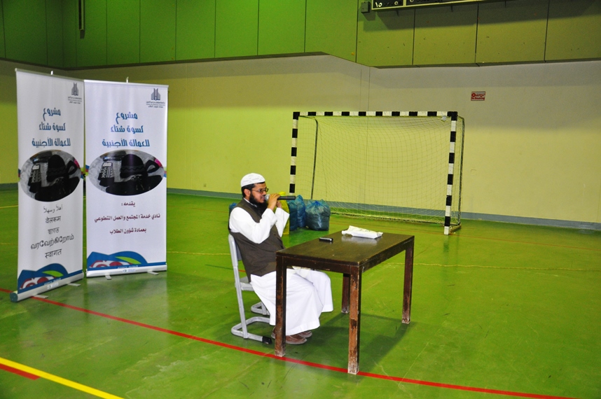 أقام نادي خدمة المجتمع والعمل التطوعي بعمادة شؤون الطلاب في جامعة سلمان بن عبدالعزيز بالتعاون مع نادي الشعلة الرياضي برنامج ( كسوة شتاء ) لعمالة الجامعة والنادي وذلك يوم الثلاثاء الموافق 10/2/1436هـ في الصالة الرياضية المغلقة بنادي الشعلة ، وقد أستضيف في هذا البرنامج داعية من المكتب التعاوني للدعوة والإرشاد وتوعية الجاليات بالخرج تحدث عن أهمية وجود العمالة في بلادنا وأنهم جزء مهم في حياتنا وأنه لا فرق بين عربي ولا أعجمي إلا بالتقوى ، بعد ذلك قدم مجموعة من طلاب الجامعة برنامجاً ترفيهياً تخلله العديد من الألعاب الحركية والمسابقات الترفيهية لاقت تفاعلاً كبيراً من العمالة واختتم البرنامج بتوزيع ما يقارب 170 كسوة شتوية للعمال ومن ثم وجبة عشاء للعمالة والمنظمين.