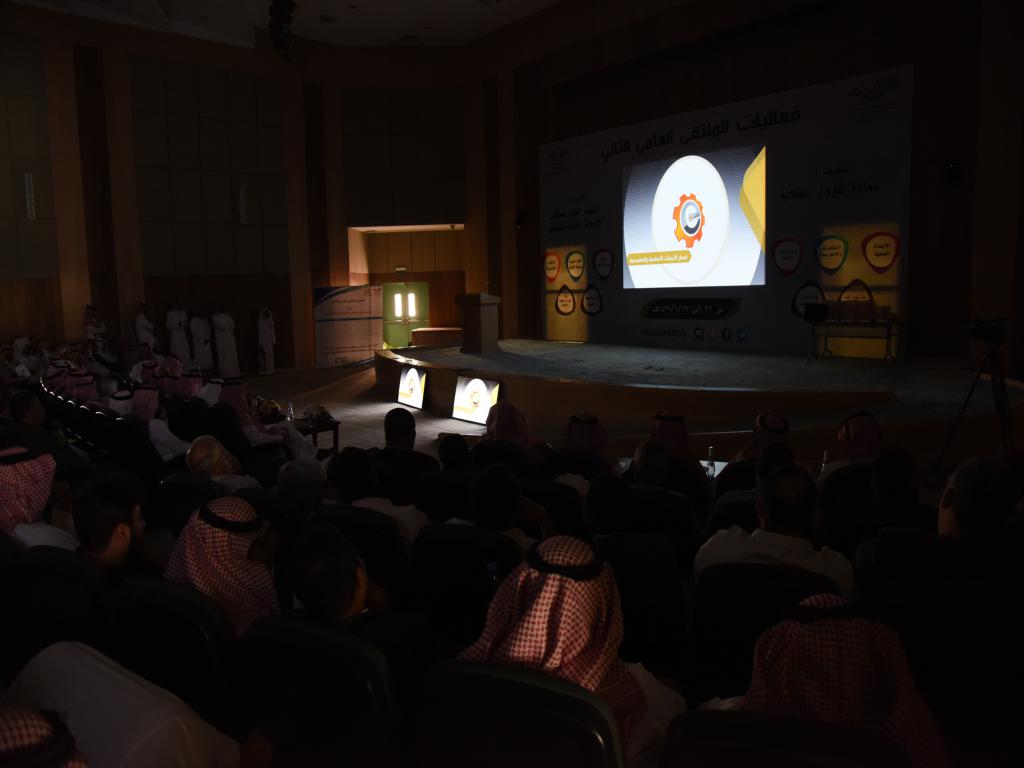 بدء الحفل بأيات من الذكر الحكيم تلاها الطالب زياد عمر دين , عقبها ألقى عميد شؤون الطلاب نائب رئيس اللجنة العليا للملتقى العلمي الدكتور ثلاب بن عبدالله الشكرة كلمة بهذه المناسبة ذكر فيها أهمية هذا الملتقيات العلمية لما توجده من حراك علمي رفيع والذي يعتبر رصيد مهاري ومنتج معرفي يوازي الرصيد المعرفي المكتسب من العملية الأكاديمية , بعدها أستعرض الدكتور الشكرة المراحل التي مرت بها أعمال الملتقى العلمي من تكوين اللجان المختصة والأعلان عنه في الكليات وبين الطلاب والطالبات , وأقامة اللقاءات التعريفية به داخل الكليات , وتقديم الدورات وأقامة ورش العمل المتخصصة والتي يمكن منها تنمية المهارات لدى الطلاب والطالبات المشاركين , كما أستعرض آلية ترشيح الأعمال من الكليات وفرزها للتحكيم النهائي مستعرضاً أعداد الأعمال التي شارك بها طلاب وطالبات الكليات في كافة محاور الملتقى , وفي ختام كلمته قدم الدكتور ثلاب شكره لمعالي مدير الجامعة أ.د عبدالعزيز بن عبدالله الحامد على دعمه هذا الملتقى وتسخير كافة الإمكانات لإقامته , ولرئيس اللجنة العليا للملتقى على متابعته الحثيثه لكافة فعاليات الملتقى العلمي الثاني , ولعمداء الكليات على تفاعلهم ومساندتهم وحثهم الطلاب والطالبات بالمشاركة , ولأعضاء هيئة التدريس بالتوجيه والمتابعة.