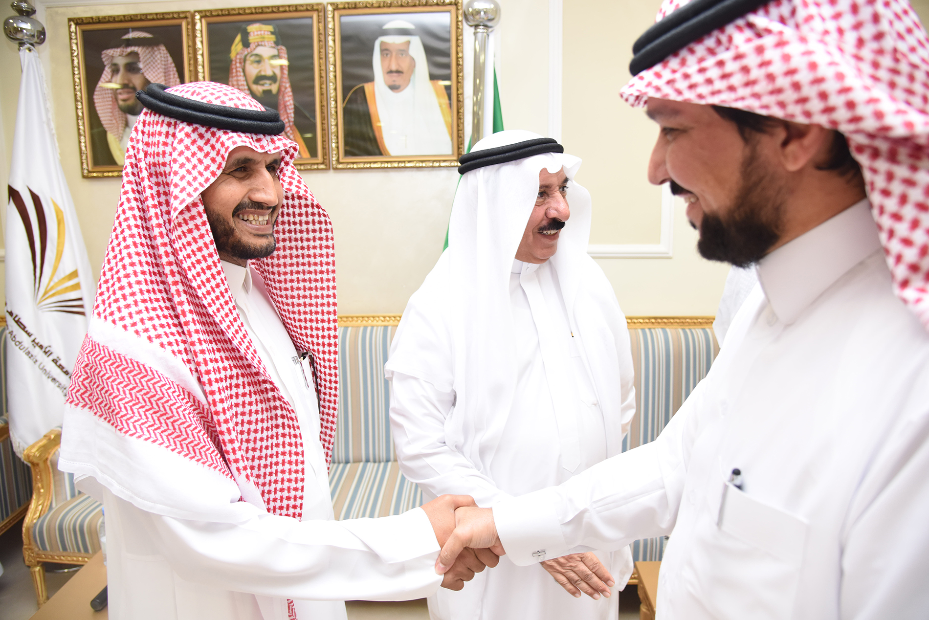 استقبل معالي مدير جامعة الأمير سطام بن عبدالعزيز أ.د عبد العزيز بن عبدالله الحامد صباح يوم الخميس 13 / 6 / 1439هـ بقاعة التشريفات بالمدينة الجامعية بالخرج أعضاء لجنة عمداء شؤون الطلاب بالمملكة والمشاركين في الاجتماع الثاني عشر للجنة التي تستضيفه الجامعة في رحابها , حيث شاهد الحضور فور وصولهم لمقر الاستقبال عرضاً للجوالة عقبه أوبريت إنشادي ترحيبي من أداء طلاب الجامعة .