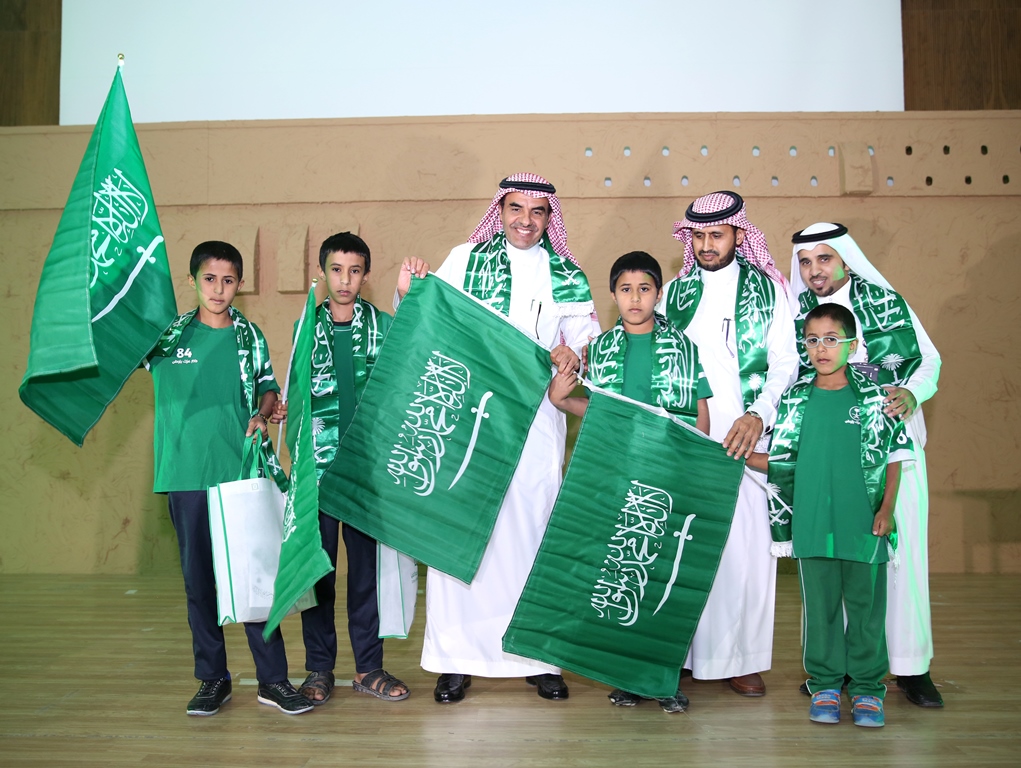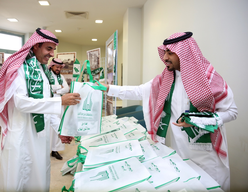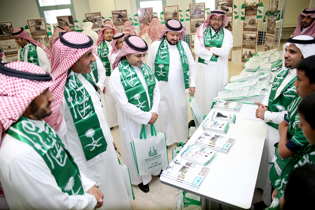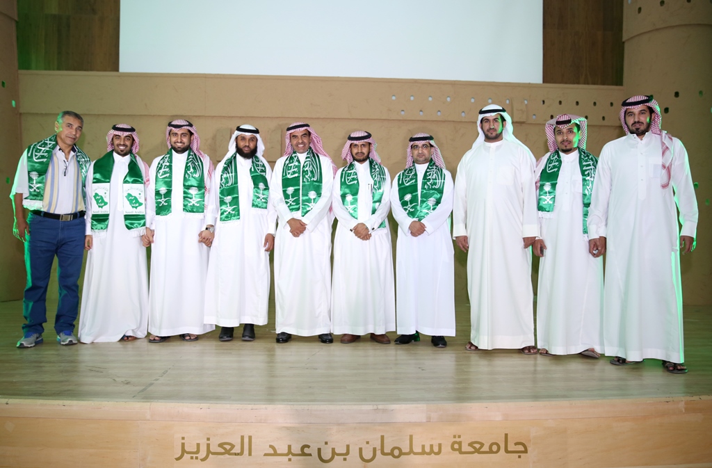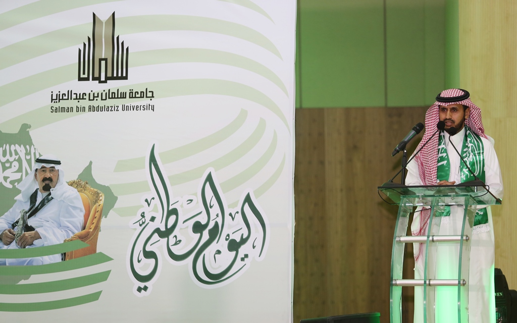 برعاية معالي مدير الجامعة الدكتور عبدالرحمن بن محمد العاصمي احتفلت جامعة سلمان بن عبد العزيز ممثلة بعمادة شؤون الطلاب باليوم الوطني الرابع والثمانين للمملكة من خلال برنامج ثقافي منوع ، صباح اليوم الاثنين ، وبحضور عدد من الوكلاء والعمداء وجمع كبير من طلاب ومنسوبي الجامعة، في مسرح الجامعة بالمدينة الجامعية.ففي بداية الحفل قام معالي المدير بقص شريط التدشين لمعرض الصور القديمة المصاحب للحفل والذي اشتمل على بعض الصور الفوتوغرافية القديمة والنادرة، للملك عبد العزيز طيب الله ثراه وعدداً لصور مدن المملكة قديماً.عقبها بدأ الحفل الخطابي المعد بآيات عطره من الذكر الحكيم، ثم ألقى عميد شؤون الطلاب الدكتور مسفر بن محماس الكبيري كلمة رفع من خلالها اسمى آيات التهاني والتبريكات إلى مقام خادم الحرمين الشرفين وولي عهده الأمين وإلى الأسرة الحاكمة وإلى الشعب السعودي الكريم بمناسبة اليوم الوطني المجيد ،هذا اليوم الأغر والذي نحتفل به اليوم جميعاً مع طلابنا الذين أرادوا في هذه المناسبة أن يستعيدوا أمجاد هذا الوطن الغالي على قلوبنا، وفي ختام كلمته قدم شكره لمعالي مدير الجامعة على دعمه المعنوي والمالي اللامحدود لأنشطة عمادة شؤون الطلاب.بعد ذلك إنطلق الأوبريت الإنشادي الذي تضمن عرضاً لفضل هذه البلاد والنعم التي خصها الله بها، كما تطرق الأوبريت الى نشأة المملكة العربية السعودية على يد مؤسسها المغفور له بإذن الله الملك عبدالعزيز بن عبدالرحمن آل سعود طيب الله ثراه، مروراً بالحديث عن النهضة المعاصرة التي تشهدها البلاد.بعد ذلك ألقى معالي مدير الجامعة الدكتور عبدالرحمن بن محمد العاصمي كلمة بهذه المناسبة قال فيها إن هذه المناسبة الوطنية المباركة التي نحتفل به جميعاً ونتذكر إنجاز التوحيد والملحمة البطولية التي وحدت أرجاء شبه الجزيرة تحت راية التوحيد وأصبحنا في أمن ورخاء ونمو وتطور ، فبأسمى وباسم كافة منسوبي الجامعة وطلابها نتقدم بأجمل التهاني والتبريكات إلى مقام خادم الحرمين الشرفين الملك عبدالله بن عبد العزيز وإلى سمو ولي عهده الأمين وسمو ولي ولي العهد حفظهم الله بمناسبة هذا اليوم الوطني ،ونسأل الله أن يعيده علينا وبلدنا في تقدم وتطور واستقرار وهذا ما نلمسه في وقتنا الحاضر من دعم كبير للتعليم العالي والتوسع غير المسبوق للجامعات مما سنلمس أثره على نهضة بلادنا نسأل الله أن يديم علينا الأمن والأمان ، وفي ختام كلمته أوصى الطلاب بالمحافظة على هذه النعمة والعمل بجد وإخلاص للمساهمة في بناء هذا الوطن الذي اعطانا الكثير.وفي ختام الحفل قام معاليه بتكريم ابناء جمعية انسان المشاركين في احدى فقرات الحفل, ثم دشن معاليه قافلة جامعة سلمان المشاركة في احتفالات اليوم الوطني بمحافظة الخرج.