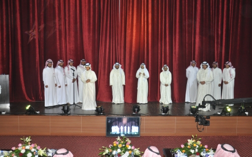 على مسرح مركز مدارس الجامعة الثقافي الحفل الختامي للانشطة الطلابية للعام الدراسي 1433 – 1434 هـ , حيث بدأ الحفل بآيات من الذكر الحكيم تلاها الطالب / مشاري القحطاني ومن ثم القى سعادة عميد شؤون الطلاب الدكتور / مسفر بن محماس الكبيري كلمة رحب فيها بمعالي مدير الجامعة و الوكلاء وعمداء العماداة المساندة وعمداء الكليات والحضور بعدها استعرض الدكتور الكبيري الأنشطة والبرامج التي أقامتها العمادة والمشاركات الخارجية التي تمت المشاركة فيها من قبل الجامعة وما سوف يقام بأذن الله, كما نوه بالدعم المستمر من معالي مدير الجامعة والوكلاء في إقامة الأنشطة وتذليل جميع المصاعب وفي ختام كلمته شكر القائمين على هذا الحفل من منسوبي العمادة والطلاب .