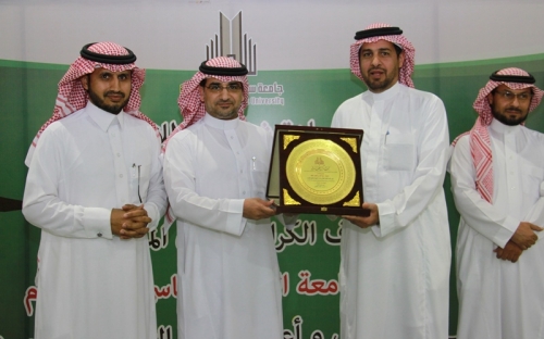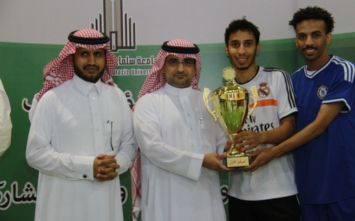 اختتمت عمادة شؤون الطلاب بطولة الجامعة الثالثة لخماسيات كرة القدم للطلاب وبطولة الجامعة الثالثة لكرة القدم لأعضاء هيئة التدريس والموظفين وذلك عصر يوم الاثنين 6/7/1435هـ بالصالة الرياضية بثانوية الهياثم بحضور وكيل الجامعة للشؤون التعليمية والاكاديمية الدكتور عبدالرحمن الخضيري وسعادة عميد شؤون الطلاب الدكتور مسفر الكبيري وسعادة المشرف على إدارة العلاقات العامة والإعلام بالجامعة .حيث لعب على نهائي خماسيات كرة القدم للطلاب فريق عمادة السنة التحضيرية وفريق كلية إدارة الاعمال بحوطة بني تميم انتهت بفوز الثاني 3/2.كما لعب على نهائي خماسيات كرة القدم لأعضاء هيئة التدريس فريق كلية العلوم والدراسات الانسانية بالخرج وفريق وكالة الجامعة للدراسات العليا والبحث العلمي انتهت المباراة بالتعادل الإيجابي 1/1 واحتكم الفريقان لركلات الترجيح والتي انتهت بفوز كلية العلوم والدراسات الانسانية 3/2.بعد ذلك تقدم سعادة الدكتور عبدالرحمن الخضيري بتكرم الفرق الفائزة وتسليم الميداليات وجائزة افضل منسق بالبطولة للدكتور ايمن الصواف, كما قدم درع شكر لحكام البطولة لكل من ساهم في انجاح البطولة