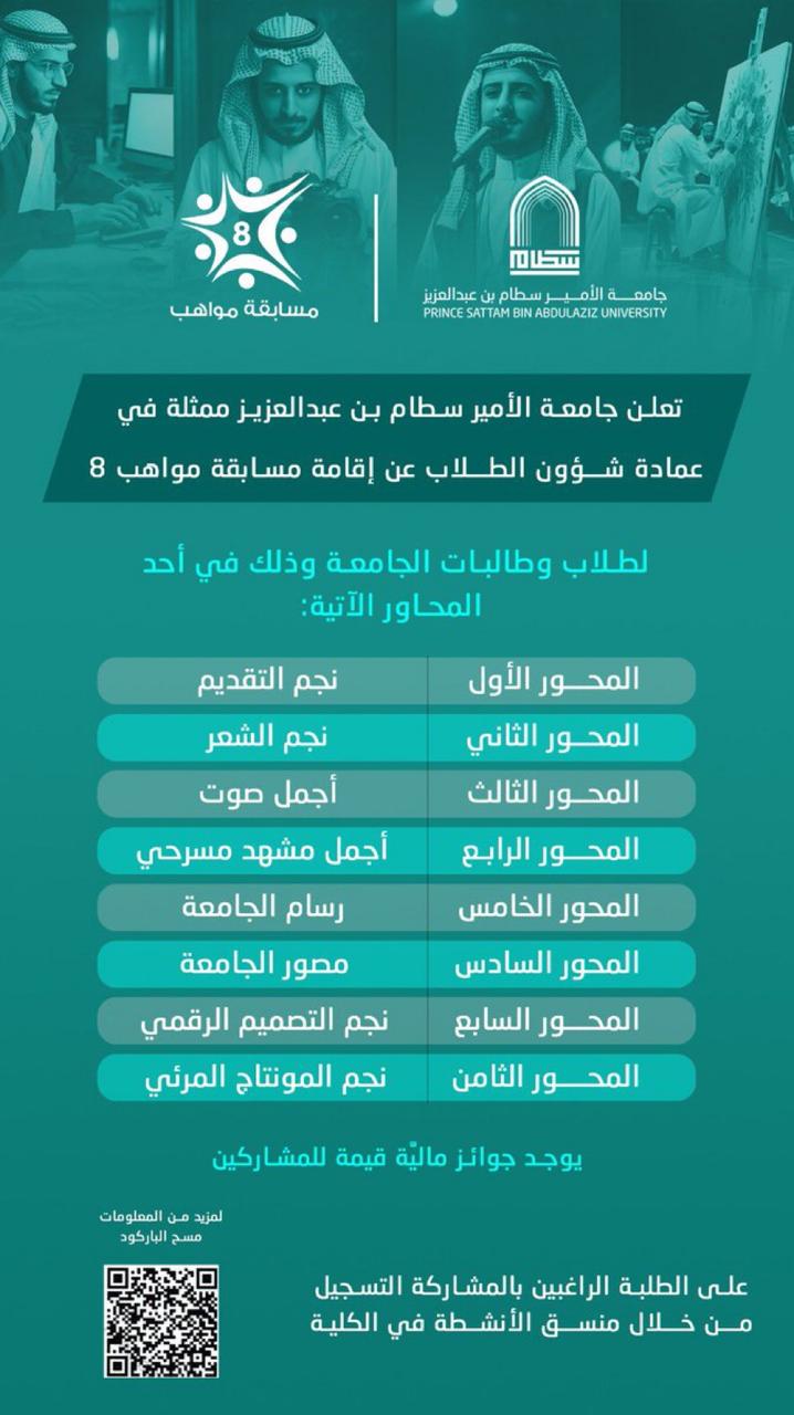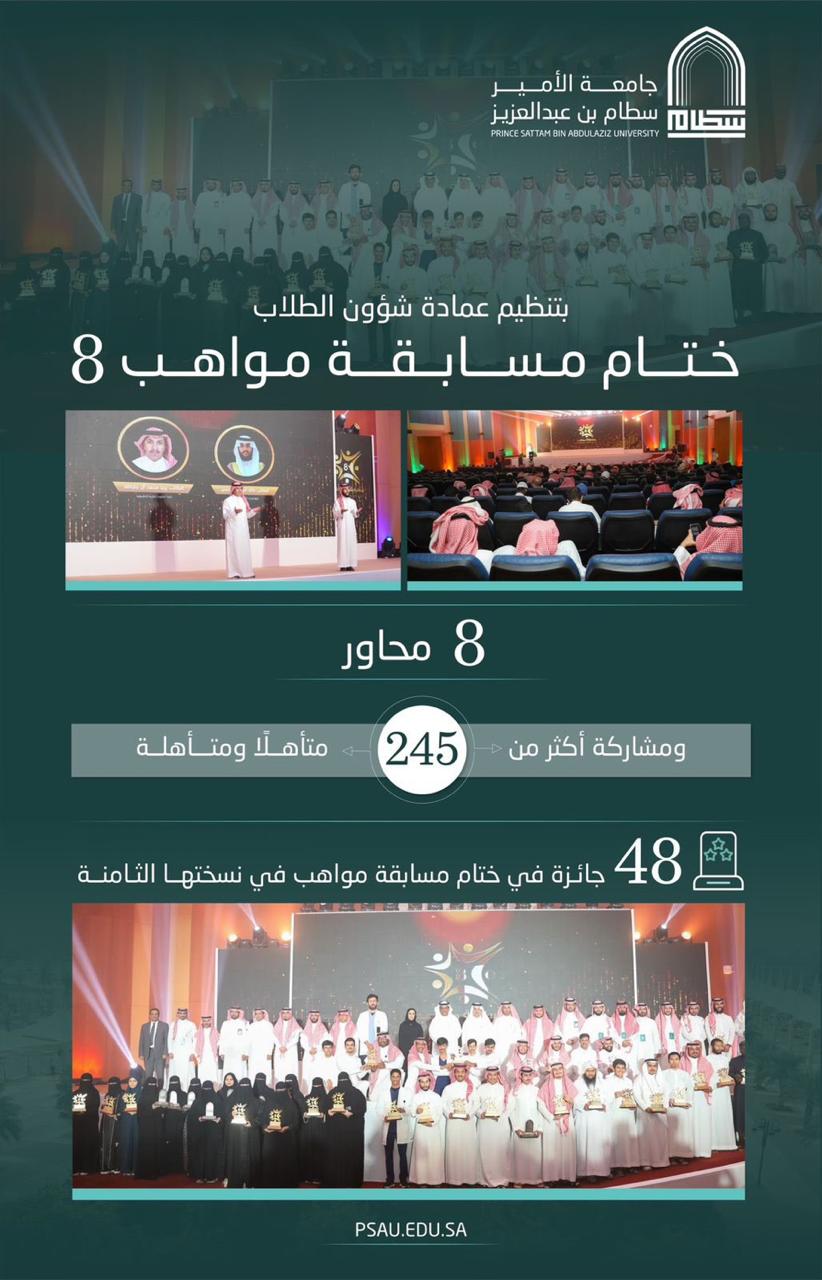 بحضور سعادة وكيل الجامعة للشؤون التعليمية والأكاديمية الأستاذ الدكتور مشاري بن عياد العصيمي؛ اختتمت عمادة شؤون الطلاب فعاليات مسابقة "مواهب٨" أمس الأحد الموافق ١٤٤٥/١٠/٢٦هـ وذلك بمسرح كلية إدارة الأعمال في المدينة الجامعية.