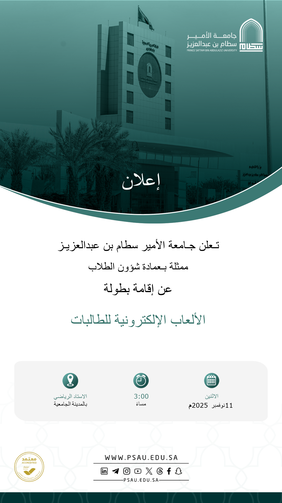 عمادة شؤون الطلاب تعلن أسماء الفائزات في منافسات بطولة الألعاب الإلكترونية التي نظمتها، وشاركت فيها طالبات الجامعة من مختلف الكليات.