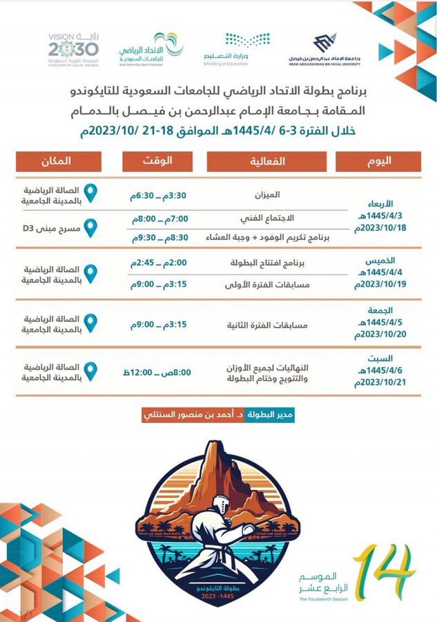تستضيف البطولة جامعة الإمام عبدالرحمن بن فيصل بالدمام خلال الفترة ٣-٦ /١٤٤٥/٤هـ، وذلك بمشاركة ١٠٠ طالب يمثلون ١٨ جامعة وكلية، وقد عقد مساء أمس الأربعاء الاجتماع الفني للبطولة برئاسة مدير البطولة الدكتور أحمد السنتلي بحضور رؤساء الوفود والحكم العام من الاتحاد السعودي للتايكوندو، وتم خلال الاجتماع إجراء القرعة واستعراض لوائح البطولة.