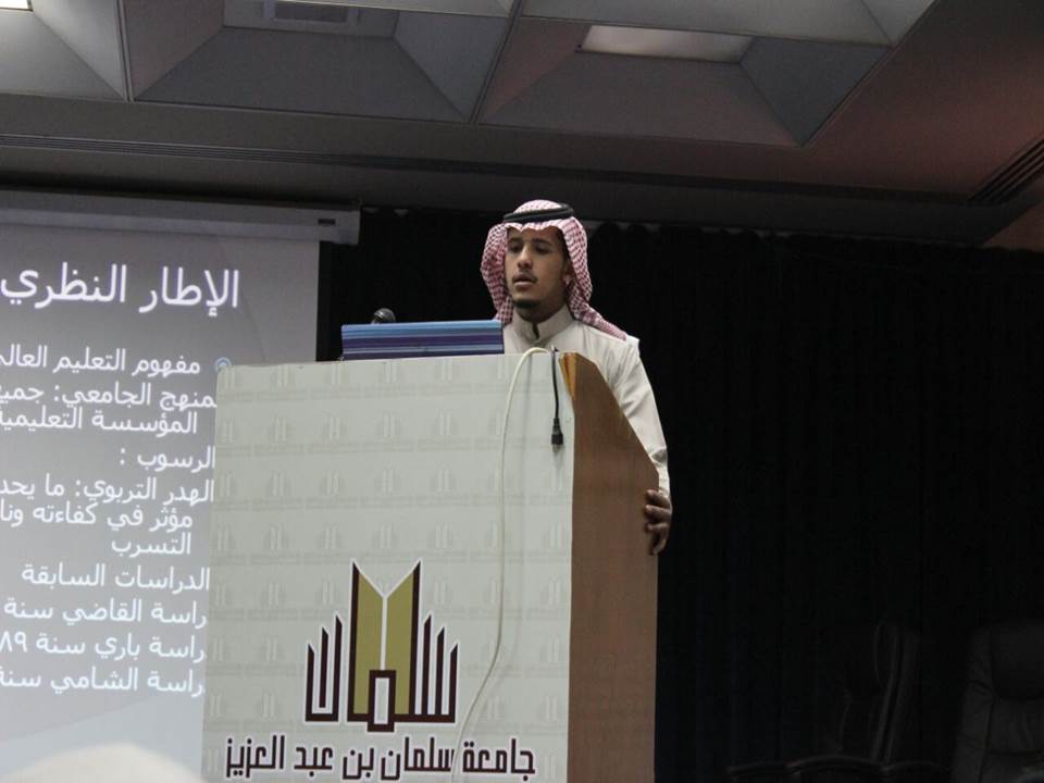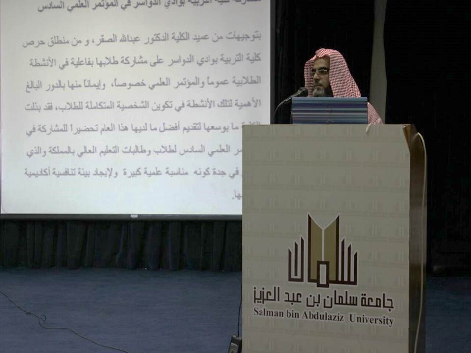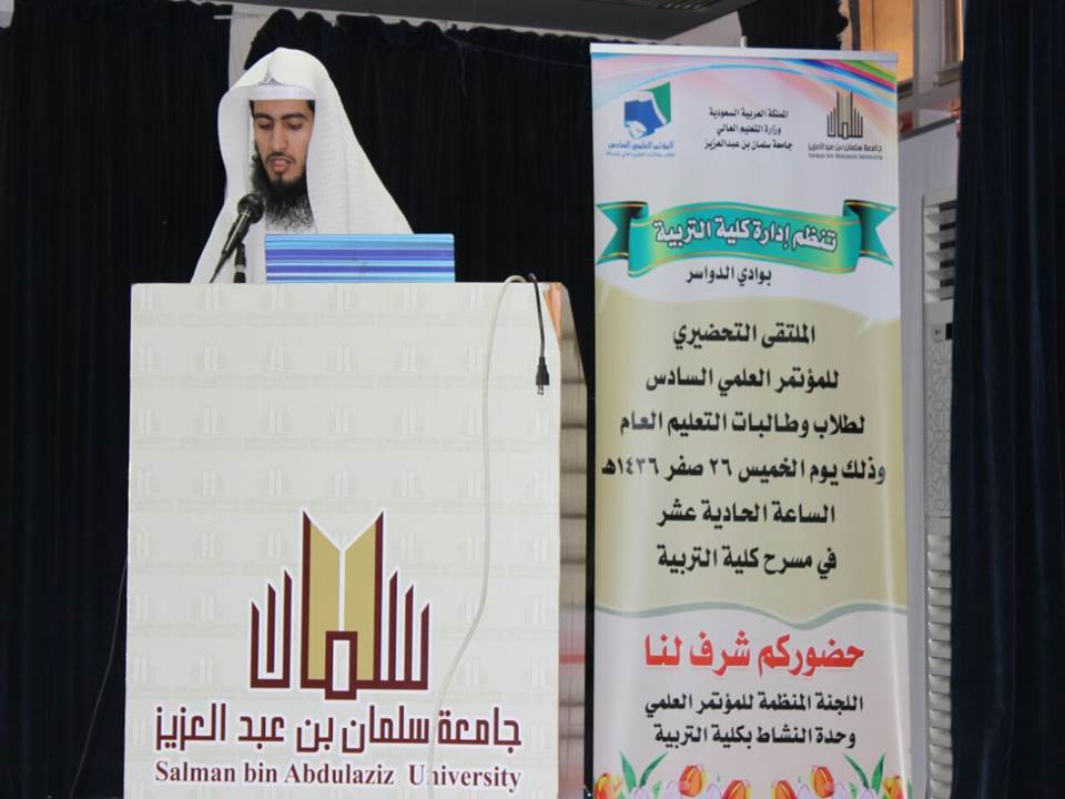برعاية أعضاء اللجنة العليا للمؤتمر أقامت كلية التربية بوادي الدواسر ملتقى علمياً تحضيرياً للمؤتمر العلمي السادس بالجامعة والوزارة، وذلك يوم الخميس 26صفر1436هـ، في مسرح الكلية.وقد حضره من أعضاء اللجنة العليا بعمادة شؤون الطلاب سعادة وكيل العمادة الدكتور/ ثلاب بن عبدالله الشكرة، وسعادة أمين المؤتمر العلمي الدكتور/ عمر بن محمد دين، وسعادة مساعد العميد للأنشطة الأستاذ/ جمال بن حمد الحمداء، وحضره كذلك من أعضاء اللجنة العليا سعادة مساعد وكيل الجامعة للفروع الدكتور/ سفر بن بخيت المدرع.كما رعاه سعادة وكيل كلية التربية الدكتور/ ناصر بن محمد آل عشوان، ونظم لفعاليات الملتقى الدكتور/ فواز شحادة منسق المؤتمر بالكلية.اشتمل الحفل على تلاوة لأحد الطلاب لآيات من القرآن الكريم، وكلمة لسعادة وكيل الكلية الدكتور ناصر، رحب فيها بالحضور، وأشار إلى أهمية إقامة مثل هذه الملتقيات العلمية لإظهار الإبداع الثقافية والعلمية والفنية للطلاب وفرق العمل.كما تضمن الحفل كلمة لسعادة وكيل عمادة شؤون الطلاب وضح فيها أن الطالب الجاد هو من يهتم ببناء شخصته ومهاراته وقدراته ويظهر إبداعاته في مشاريع ومشاركات ملموسة يقدمها للمجتمع والوطن.ثم عرض الطلاب مشاركاتهم العلمية والبحثية مستعينين بعروض البوربوينت لتسهيل إيصال المعلومة للجمهور، كما تم عرض الأعمال الفنية في المعرض المصاحب للملتقى.