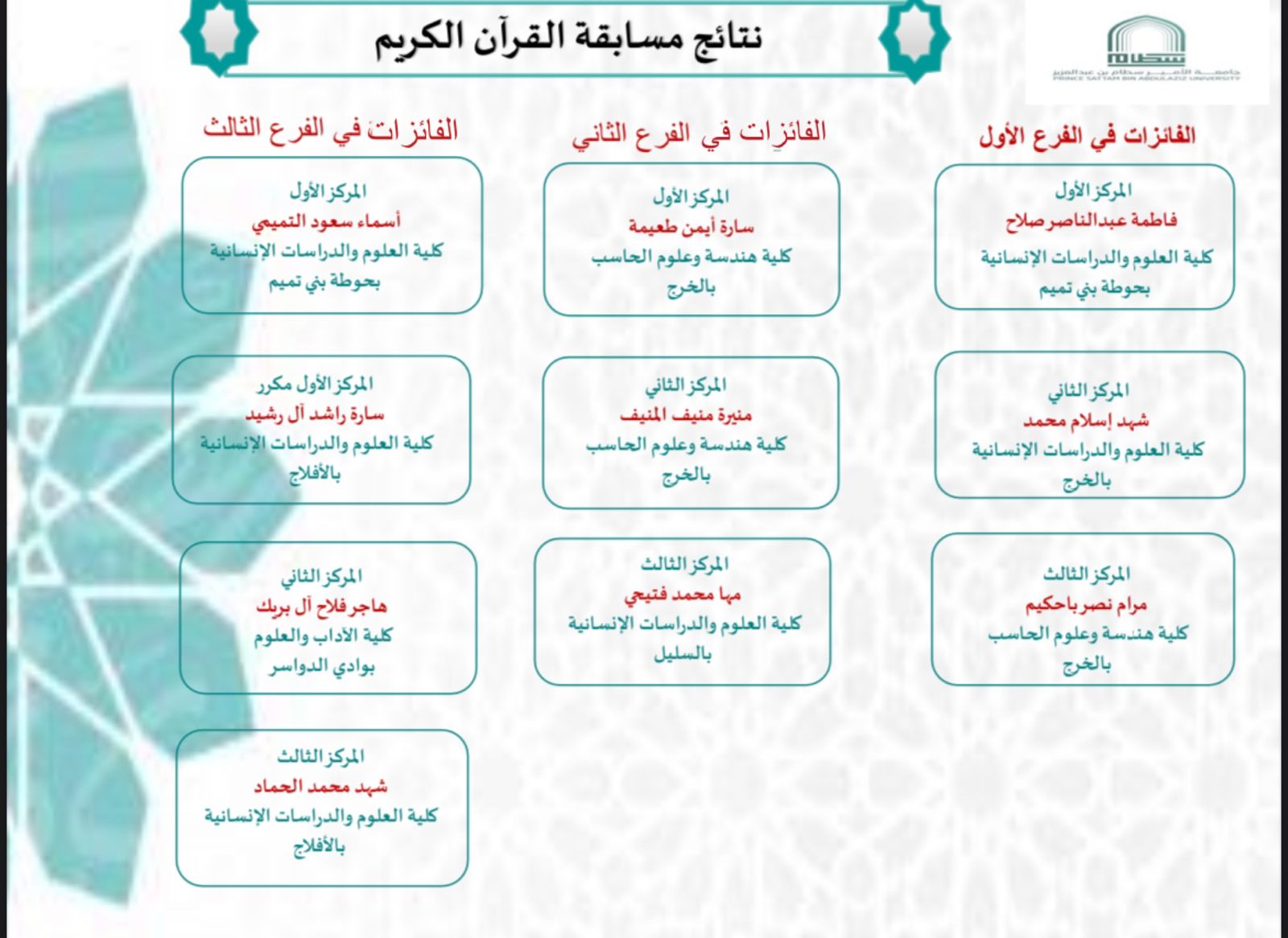 The Holy Quran competition consisted of five branches. The first branch is the complete Holy Qur’an, 30 parts; The student Fatima Abdel Nasser Salah won the first place from the College of Science and Humanities in Al-Kharj, and the student Shahad Islam Muhammad won the second place from the College of Science and Humanities in Al-Kharj, and the third place won from the College of Engineering and Computer Science in Al-Kharj, Maram Bahakim.<br>
