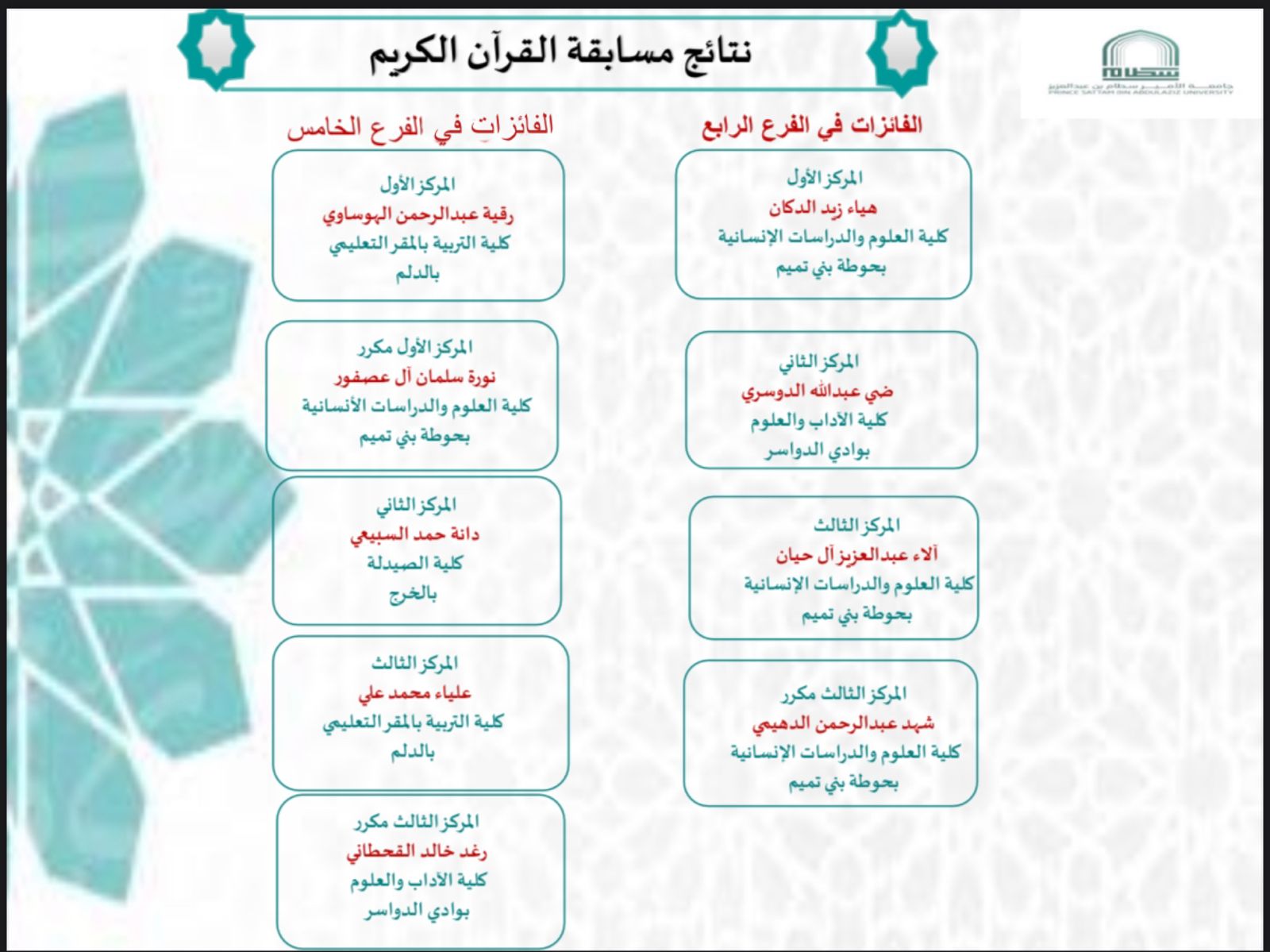 The fifth branch is recitation; The student Ruqaya al-Hawsawi won the first place from the College of Education in Dilam, the first place repeated from the College of Science and Human Studies in Al-Houta, the student Nora Al-Asfour, and the second place won from the College of Pharmacy in Al-Kharj, the student Dana Al-Subaie, and the third place won from the College of Education in Al-Kharj, the student Alia Muhammad Ali, and the student won the third place The student Raghad Al-Qahtani won the third place from the College of Arts and Sciences in Al-Wadi.</p>