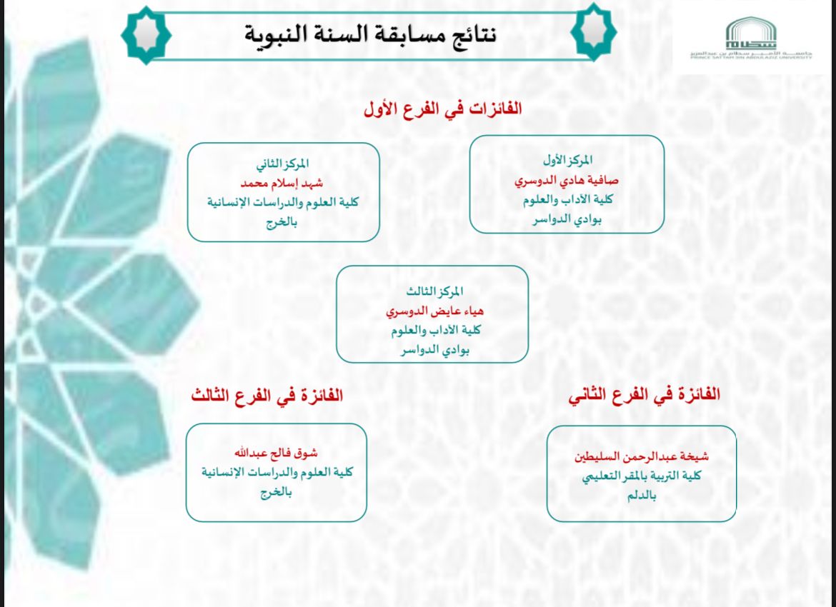 <p>As for the competition of the Sunnah of the Prophet, it included three branches; The first section contains 80 hadiths from the book “Adhkar wa’l-Adab”, introductory level (Matoun Talib al-Ilm); The student Safia Al-Dosari won the first place from the College of Arts and Sciences in Al-Kharj, the student Shahad Islam Muhammad won the second place from the College of Arts and Humanities in Al-Kharj, and the third place won from the College of Arts and Sciences in Al-Wadi student Haya Al-Dosari.<br>