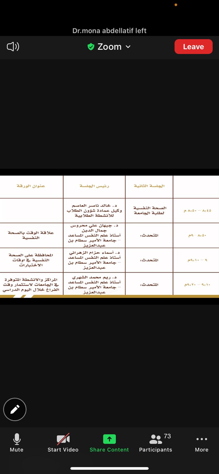 <p>Under the patronage of Prince Sattam bin Abdulaziz University Vice Dean for Educational and Academic Affairs, Prof. Dr. Mishari bin Ayyad Al-Osaimi; Last Monday evening, the Guidance and Counseling Unit at the Deanship of Student Affairs concluded in cooperation with the Executive Committee for the Promotion of Mental Health at the university. The activities of the first forum entitled “Mental Health and Investing in Leisure Time”, which was held virtually with the participation of a number of faculty members from the psychology departments at the university. The forum began with a speech by His Excellency the Vice Dean of Student Affairs, Dr. Khaled Al-Asim, in which he welcomed the attendees, and explained the objectives of holding this forum by promoting the concept of mental health among university students, and raising their awareness of the importance of investing free time, identifying the psychological challenges they face during exams, as well as clarifying the importance of student activities in promoting their mental health. After that, the Vice Rector for Educational and Academic Affairs delivered a speech, in which he affirmed the university’s interest in promoting the mental health of university students through developing programs and activities that help them invest their spare time and develop their skills. He affirmed his happiness; The importance of this forum lies in what it contains of interesting topics and successful experiences in the field of mental health promotion, and that the long experiences of Saudi universities in facing challenges have resulted in many positives and lessons gained by experience in the field of mental health promotion, and this will contribute in the future to building distinguished programs The desired goals were achieved, God willing, and at the end of his speech, he thanked the participating faculty members and the Deanship of Student Affairs for holding this forum. After that, the forum sessions began, the first of which was entitled “The Importance of Time and Methods of Investing It” in which three scientific papers were presented, and then the second session entitled “Mental Health of University Students” and included three scientific papers as well. The meeting concluded with a number of recommendations.</p>