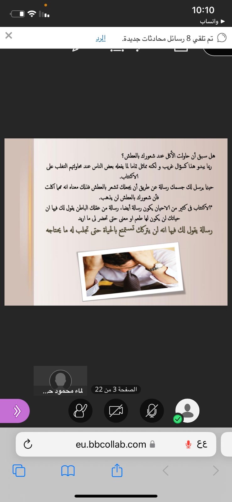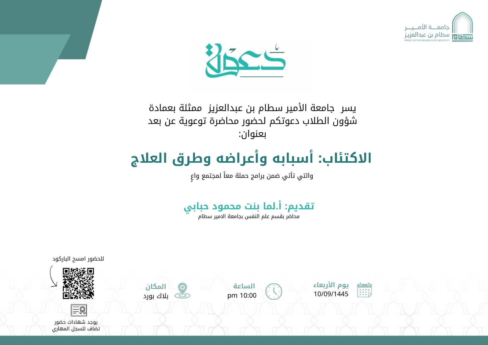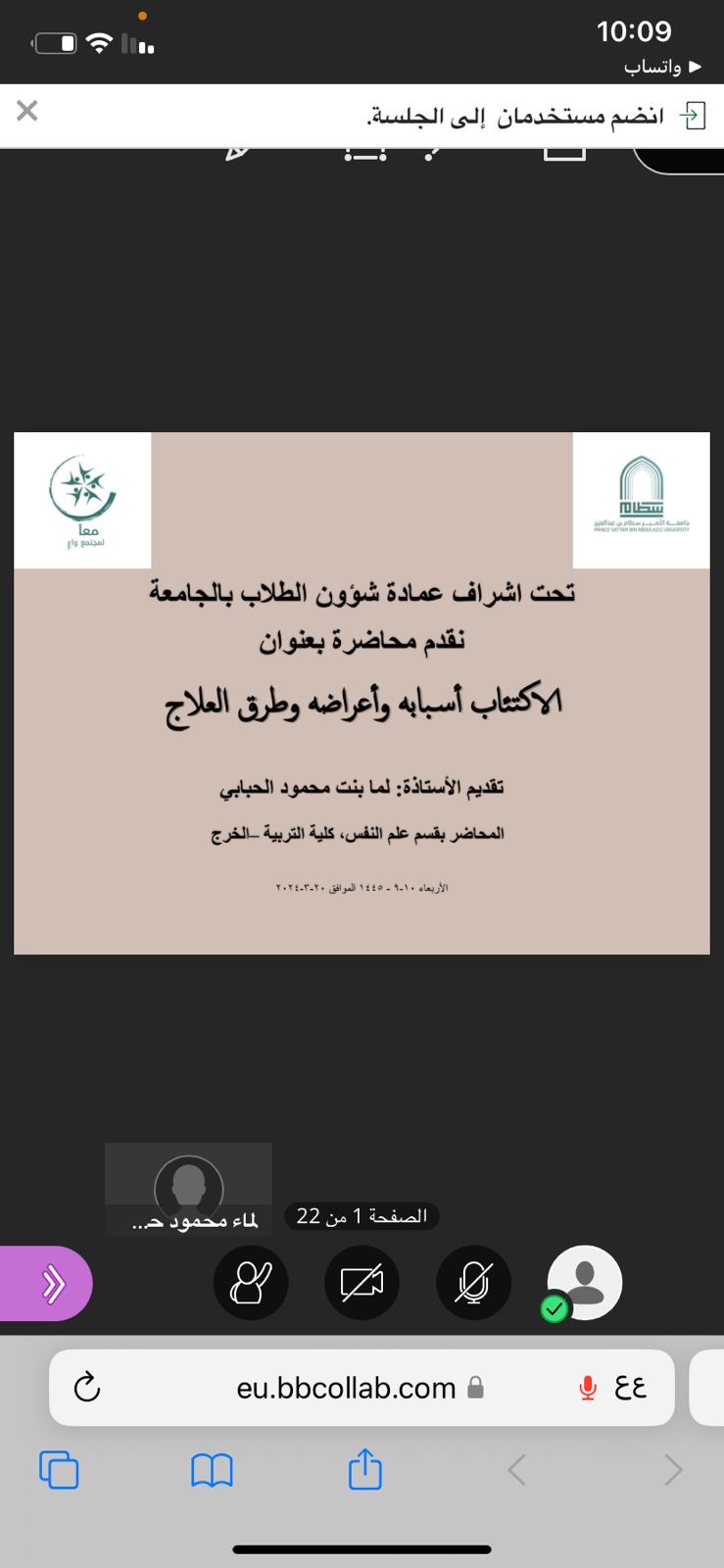 <p>The lecture was presented by Professor Lama Hababi, a lecturer in the Department of Psychology at the College of Education, where she provided a comprehensive explanation of depression and talked about its various symptoms. She also discussed the factors that may lead to depression and provided advice for preventing this disease, such as exercising regularly and eating Eat healthy, get enough sleep, and maintain positive social relationships.</p>
