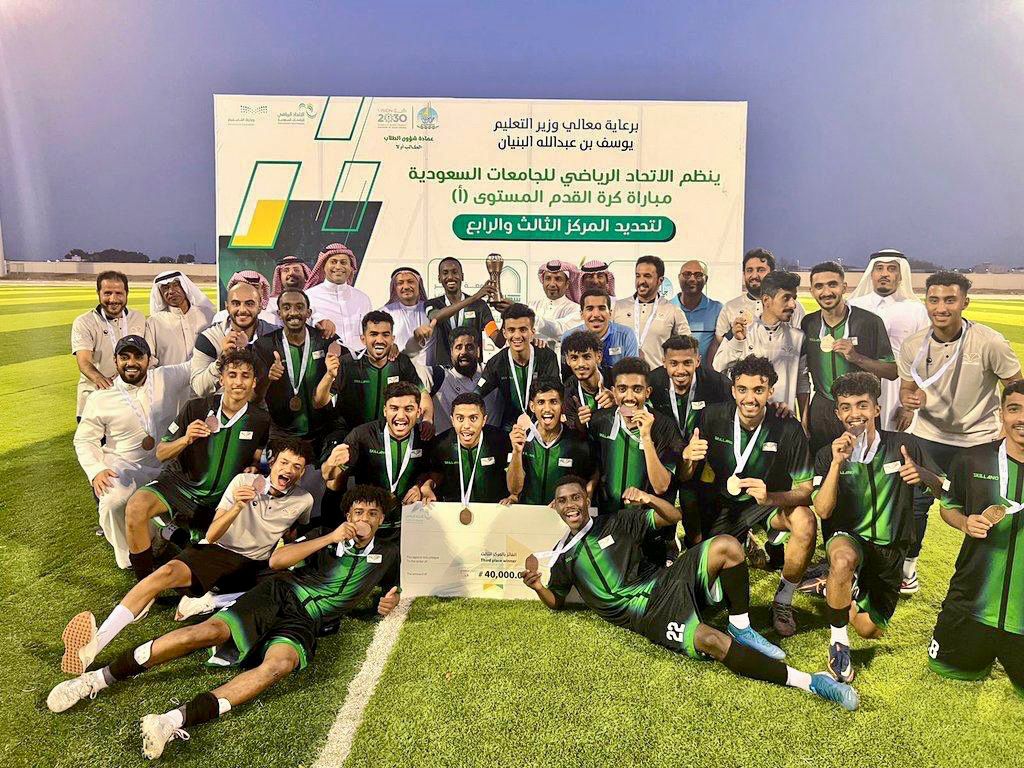 <p>The Prince Sattam bin Abdulaziz University team achieved third place and bronze medals at the university level, after defeating the Jazan University team on Thursday afternoon corresponding to 8/24/1444 AH; This is part of the Sports Federation of Saudi Universities Football Championship.<br>