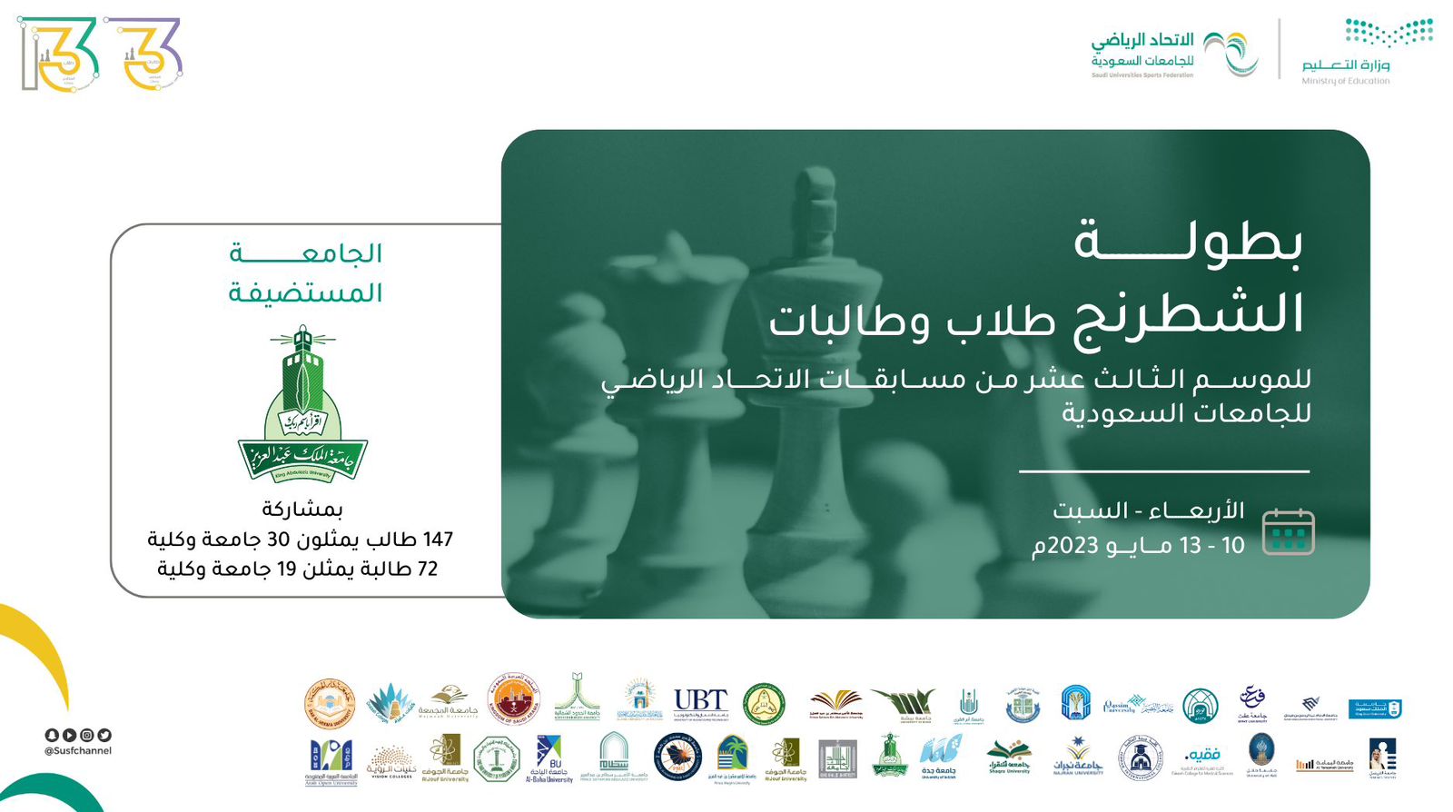 <p>The Prince Sattam University team is participating in the Saudi Universities Chess Championship, which started on Wednesday. It is organized by the Universities Sports Federation in its 13th season (for male and female students), and the tournament will last for 4 days, 10/13 May, hosted by King Abdulaziz University in Jeddah.</p>