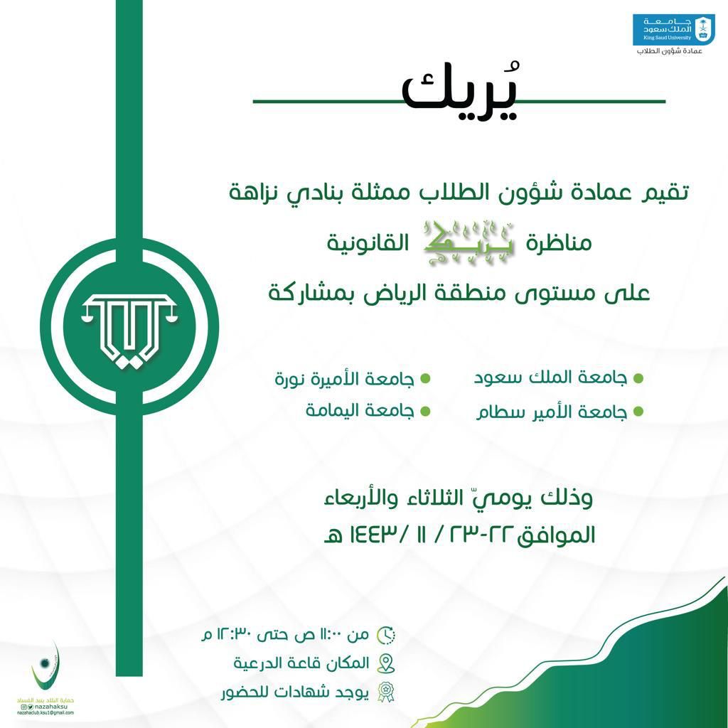 <p>In the presence of the Dean of Student Affairs, Dr. Thalab bin Abdullah Al-Shakrah, the University’s Integrity Club achieved second place during its participation in the legal debate “You”; Organized by the Deanship of Student Affairs at King Saud University, represented by the Nazaha Club, at the level of the Riyadh region; Which was held on Tuesday 11/22/1443 AH and lasted for two days in Diriyah Hall.<br>